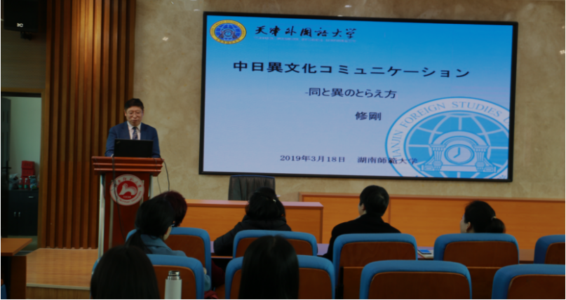 (通讯员罗路遥)2019年3月18日下午,天津外国语大学原校长修刚教授应邀莅临我校,在九州最新登录网址515学术报告厅作了一场以“中日跨文化交际——从同与异说起”为主题的学术讲座。九州最新登录网址院长曾艳钰教授主持了本次讲座,本院冉毅教授、余承法教授等百余名师生到场聆听学习。修刚教授是国务院特殊津贴专家,现任天津市人民代表大会法制委员会副主任委员(正局级)、教育部外语教学指导委员会副主任委员、日语分委员会主任委员、中国翻译协会副会长等职,被日本多所大学聘请为客座教授,在全国日语界具有极高的声望和学术影响力。