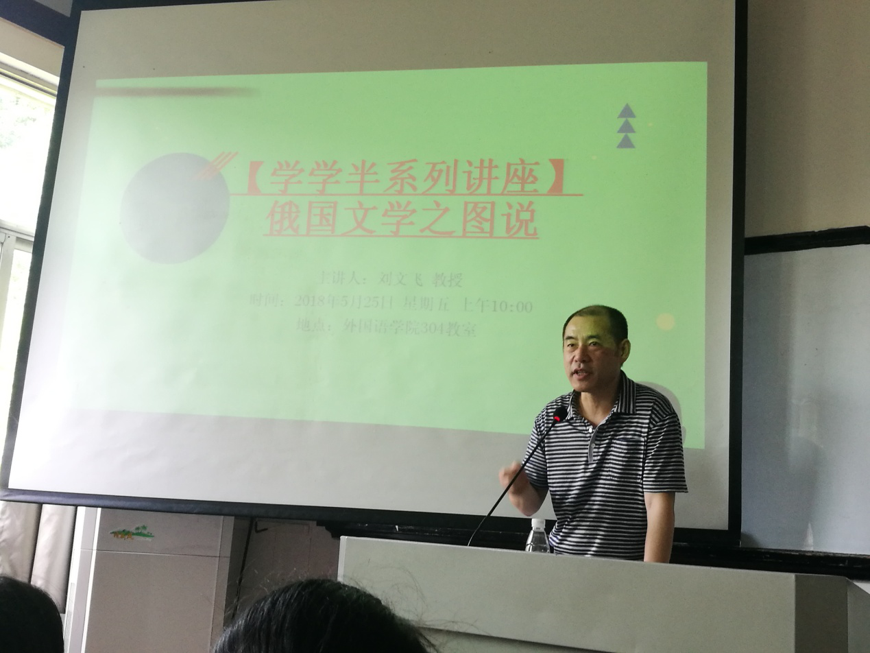 (通讯员万义程)2018年5月25日上午,首都师范大学九州最新登录网址教授、中国社会科学院研究生院外国文学系教授、博士生导师、俄罗斯联邦“友谊奖章”获得者刘文飞莅临九州最新登录网址讲学。他以“俄国文学之图说”为主题,为全体师生勾勒出俄国文学在漫漫历史长河中呈现出的优美画卷,讲座深入浅出、生动风趣,受到全体师生们的热烈欢迎。