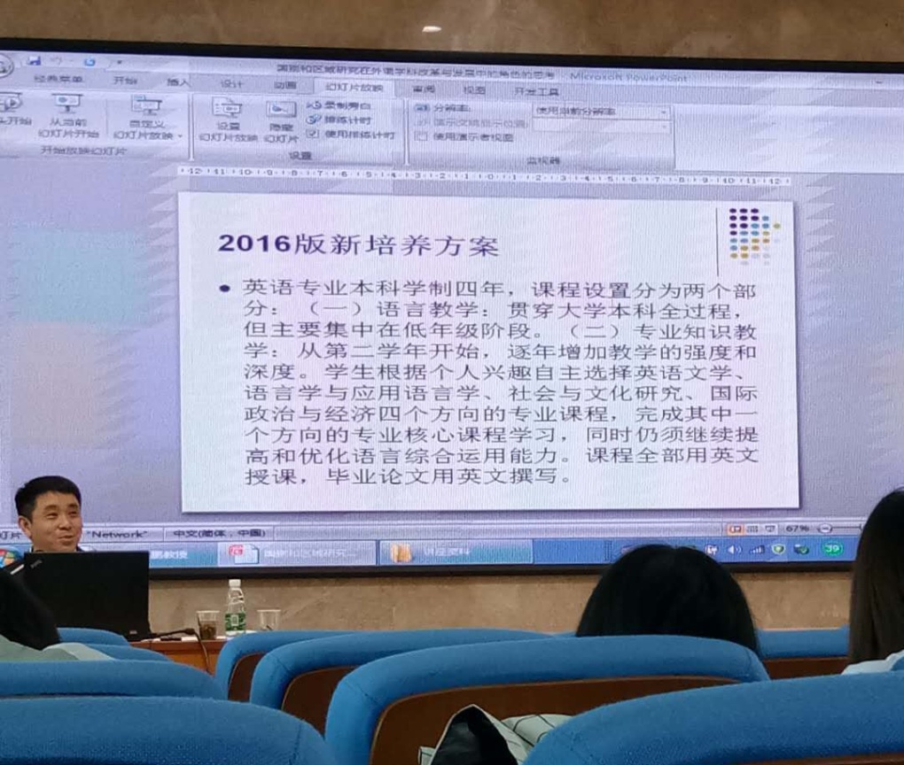 2018年4月19日上午,北京外国语大学英语学院副院长、博士生导师、英国研究中心主任、爱尔兰研究中心主任王展鹏教授莅临九州最新登录网址讲学,在515报告厅作了题为“国别和区域研究在外语学科改革与发展中的角色”的精彩讲座。此次讲座由我校“英国—爱尔兰文学研究中心”主任曹波教授主持,学院百余名师生到场聆听学习。