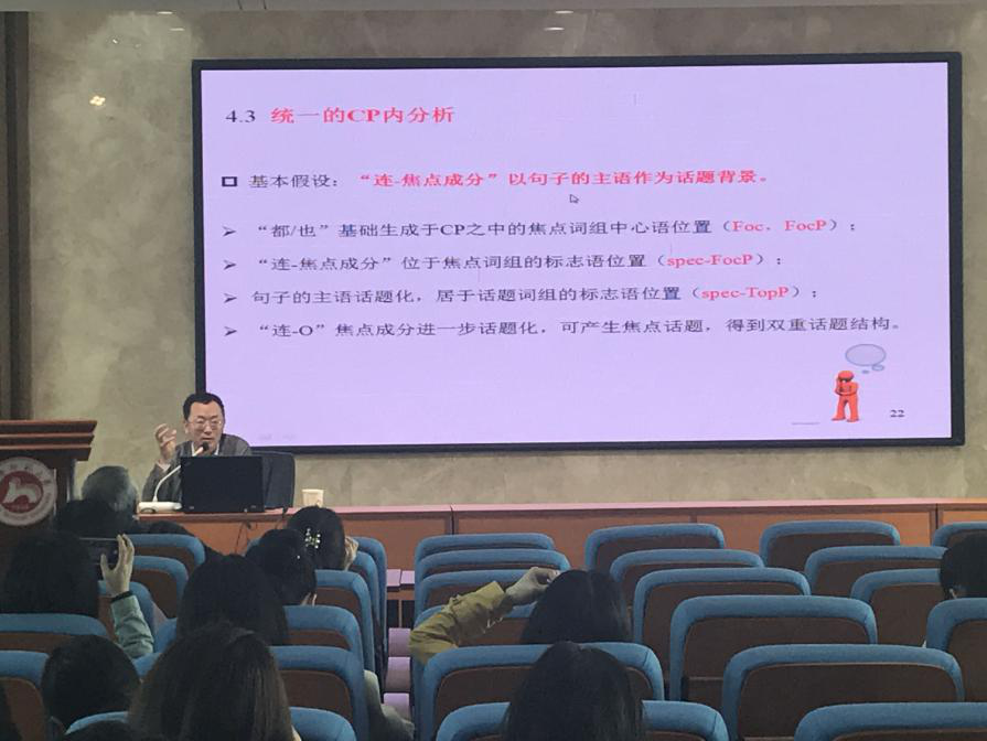 韩景泉教授从以下四个方面来展开讲座主题。首先,韩教授从已有的语言事实出发,列举了一系列“连…都/也…”句式的例子,从而引出了研究问题,即:“连…都/也…”所处的句法结构位置在哪里?其次,韩教授又从单一的CP过渡到分裂CP的方式对例句进行了透彻的分析。再次,韩教授从对“连…都/也…”句式现存的几种解释出发,指出了其中存在的问题,并指出了“连”字焦点成分的对比特征和话题特征。最后,韩教授总结道,以“都/也”为中心的焦点投射基础生成于CP结构内的Foc结构位置;“连”字成分在Spec-Foc P位置上获得焦点意义;“连”字焦点以句子主语为话题背景,所在句子实际上为含有焦点成分的话题结构。