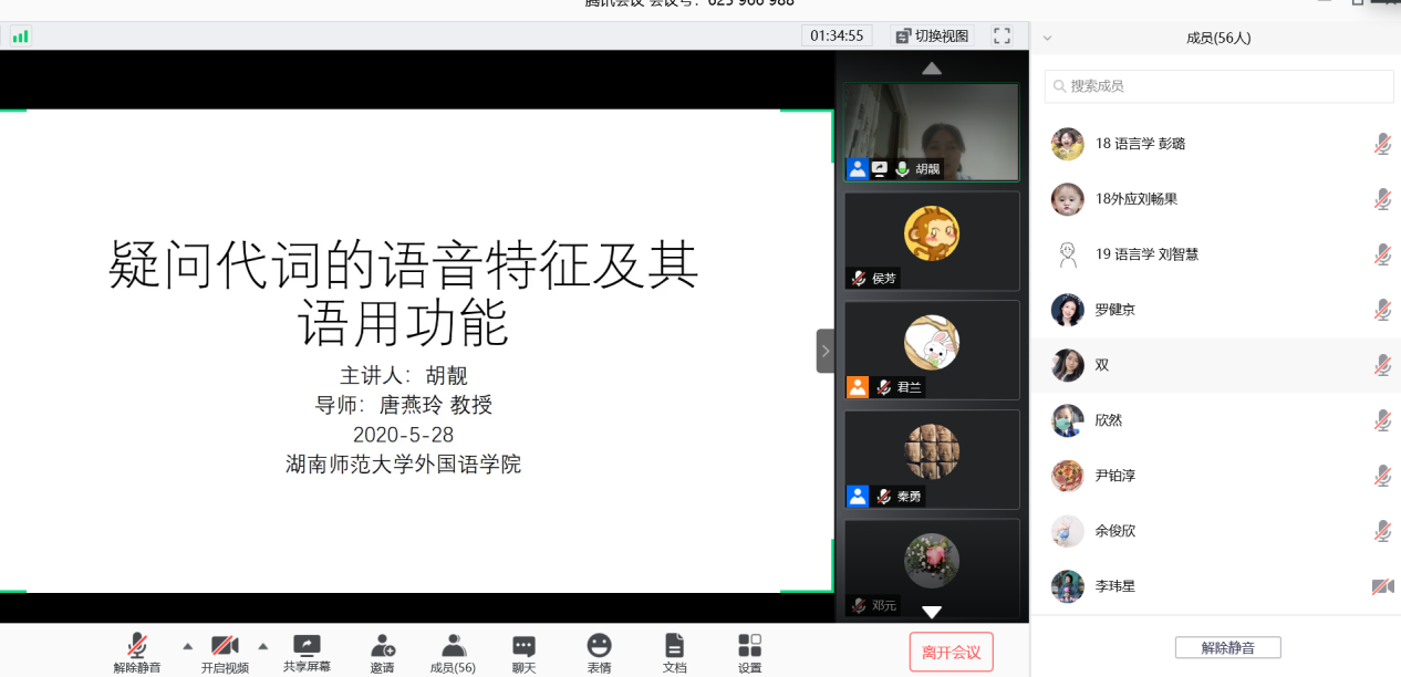 胡靓博士生的主讲题目为疑问代词的语音特征及其语用功能。她采用了实证的方法,以疑问代词“什么”为例探讨疑问代词的语音特征和语用功能。认为语言是在语音的产出和语音的感知交互作用下更能显出其魅力。语音的感知建立在产出的基础之上,而产出是否有意义离不开语音感知。