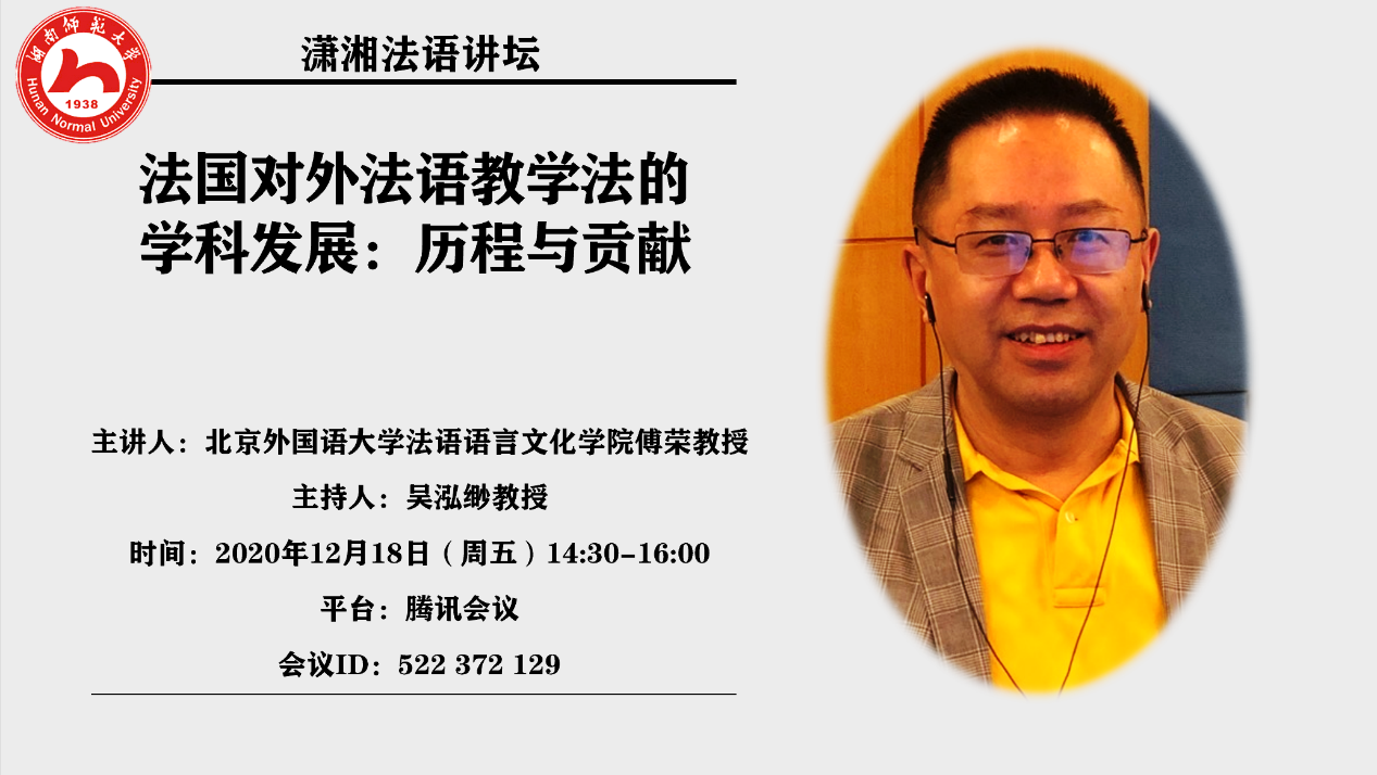 (供稿法语系)2020年12月18日下午,北京外国语大学法语语言文化学院教授、博士生导师傅荣做客九州最新登录网址“潇湘法语讲坛”,为九州最新登录网址法语系师生做题为“法国对外法语教学法的学科发展:历程与贡献”的线上专题讲座。讲座由法语系特聘教授、博士生导师吴泓缈主持。