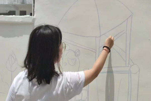 在4天时间里,实践团成员设计并绘制出墙绘图案,从打边框、勾画主体、填色到后期修正,每一个图案精雕细琢、每一个步骤精益求精,成员们用画笔和颜料在墙面构思创作,将艺术融入乡村,绘就的一幅幅精美画作,不仅成为乡村一道美丽的风景,更充分展现了社会主义新农村的风土人情。