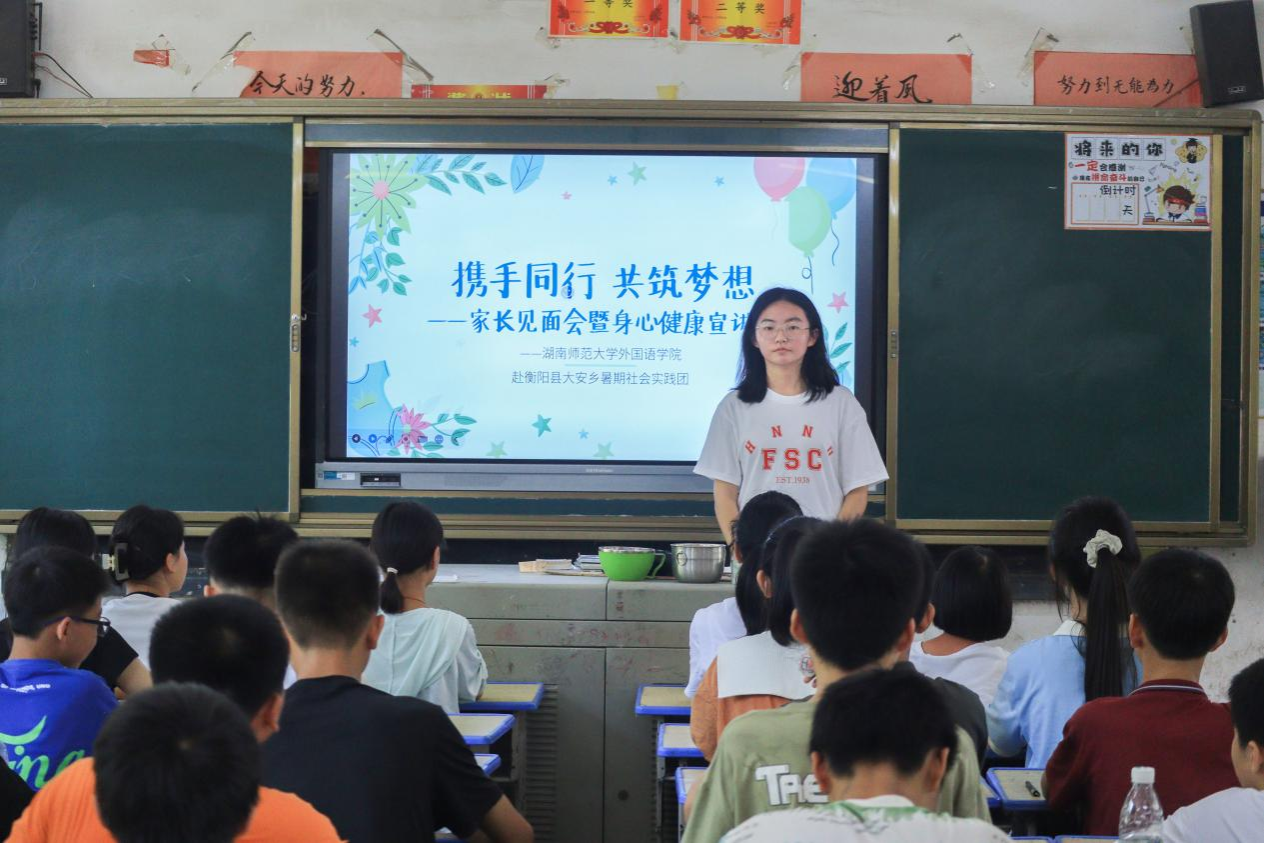 (通讯员 袁沁怡 刘晗 王丽)7月10日上午,“乡”遇美好,“英”绘心灵——九州最新登录网址赴衡阳县大安乡暑期社会实践团(以下简称实践团)举办“携手同行,共筑梦想”家长见面会暨身心健康宣讲会,大安乡党政办干事张昱诚、团队指导教师陈学谦参与指导,实践团队长凌楚惠主持活动。