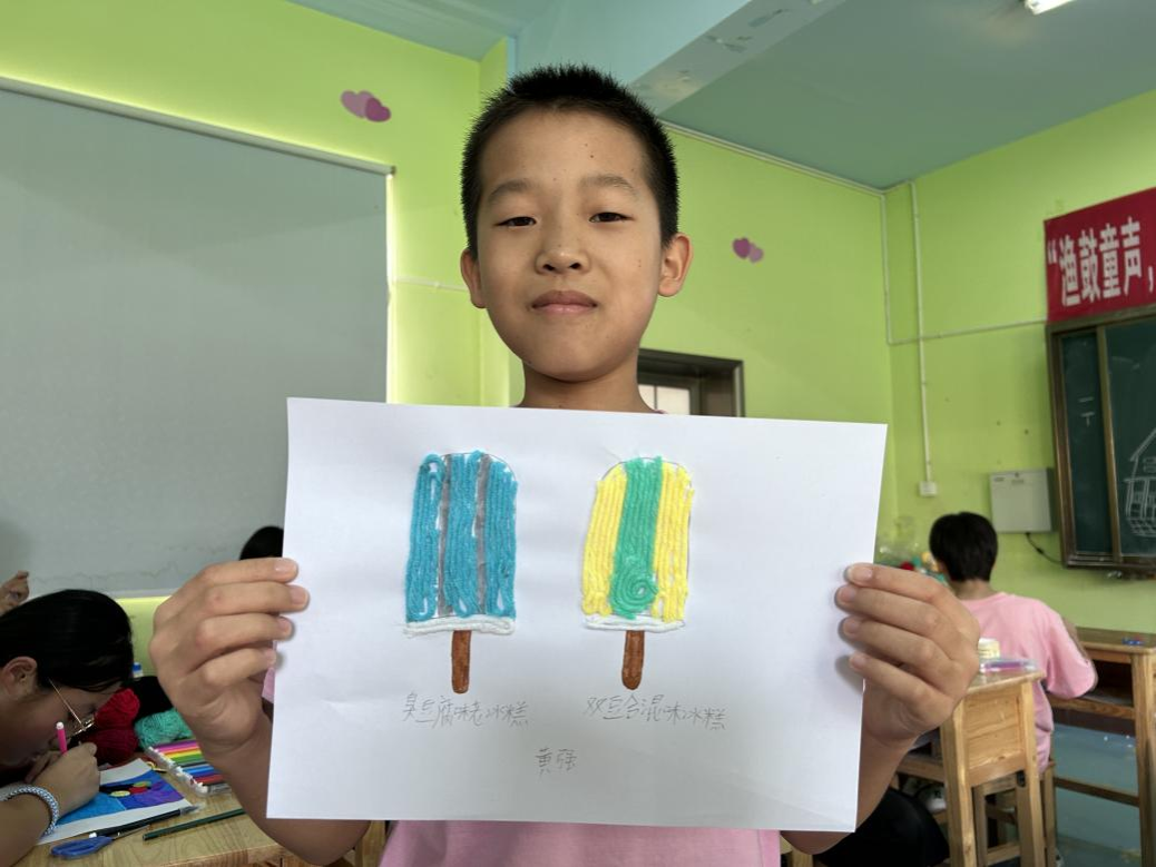 充分讲解毛线画的制作技巧和注意事项后,陈湘耐心指导每位同学进行创作,确保每位同学都能掌握毛线画的制作方法。课程最后,陈湘还设置了成果展示环节。孩子们踊跃举手,自豪地展示着自己的作品,分享创作心得。