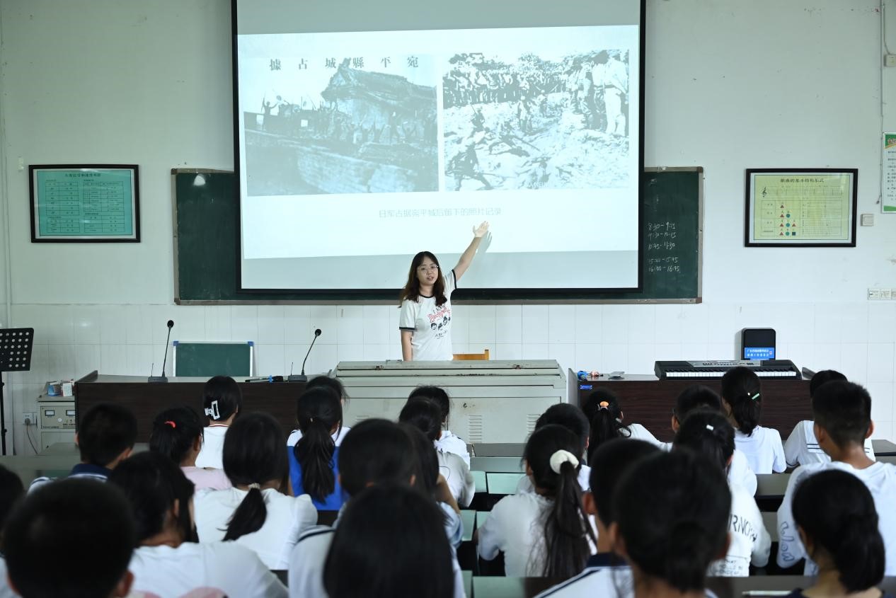 (通讯员 谢璐怡 龚佳倩 刘雨晴)7月7日下午九州最新登录网址“蒲公英”赴资兴市第三中学暑期社会实践团在资兴市第三中学第一多媒体教室开展纪念抗战85周年“牢记历史,吾辈当强”党史宣讲活动。队长龚佳倩作为主讲人向三中学子讲述在中国共产党的号召下中国人民英勇抗战的故事,带领大家重温抗战精神,并以“记忆从未褪色,历史仍有回响。今日山河日新,吾辈当自强。”勉励学生铭记历史,奋发图强。