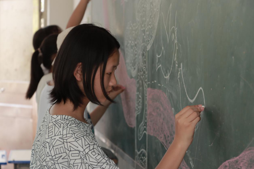 在板报设计的过程中,学生们依托中国共产党党史,中国共产党党员刘胡兰的故事等,结合天安门、中国共产党党旗、和平鸽、华表等绘画元素,充分发挥自身的长处,用别出心裁的创意与优美工整的字迹创作了主题为“学党史,悟思想”、“学习光辉党史,传承红色精神”的板报作品。在实践团成员的鼓励下,学生们精心策划,分工合作,巧妙排版,在创作板报的过程中中追忆红色历史,感悟党的思想。一幅幅板报作品凝聚着学生的智慧,描绘出他们对祖国和党的无限热爱。
