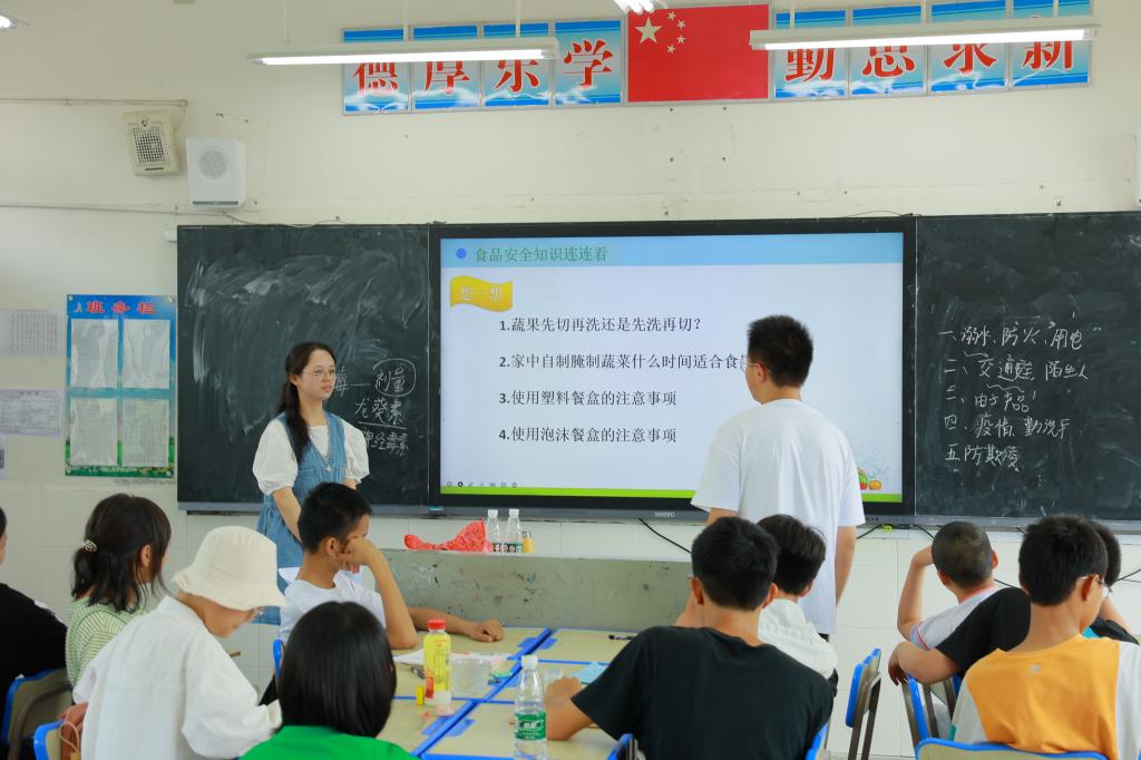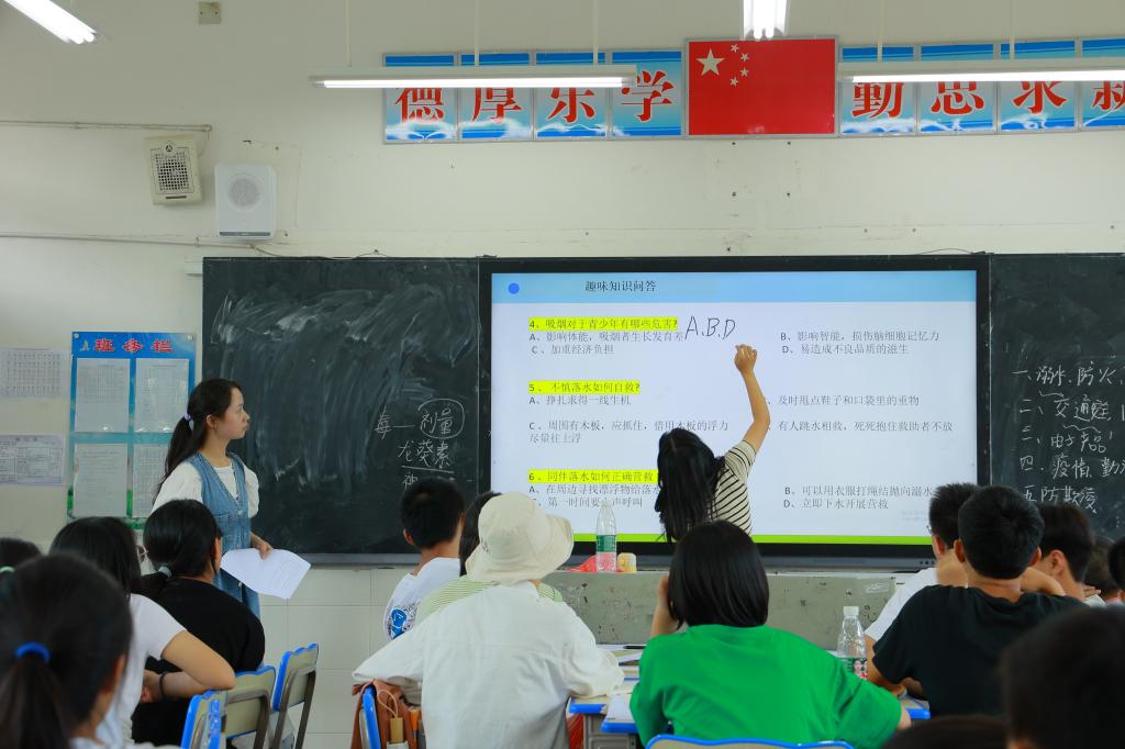 课堂教学内容涵盖食品安全、防溺水安全、电器使用安全及校园防欺凌等多个方面。刘佳妮寓教于乐,通过视频播放、知识问答、情景表演等多种方式展开课堂,学生们踊跃参与课堂互动,积极回答问题。