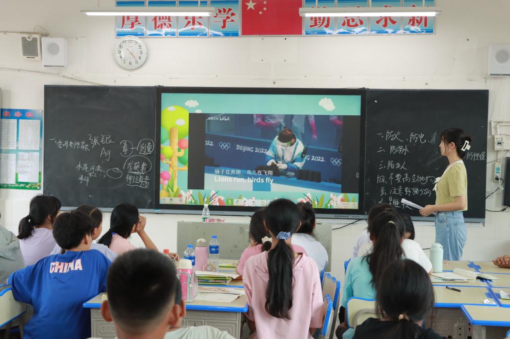 课堂伊始,李美姿以视频引入课堂主题,双语介绍志愿精神-奉献、友爱、互助、进步,并通过雷锋、白求恩等耳熟能详的人物帮助同学们理解和感悟志愿精神的内涵。回顾2022年冬奥会,李美姿带领同学们感受中国青年志愿者的热情服务和无私奉献,寄语同学们心怀梦想,将个人“小我”与祖国“大我”紧密相连。随后,李美姿分段逐句教唱《奉献的青春》,同学们在音乐中领悟志愿精神,从歌声里汲取奉献力量。课后,饶世爽、石胜平主动为办公室、教室的饮水机换水,以实际行动践行志愿精神。