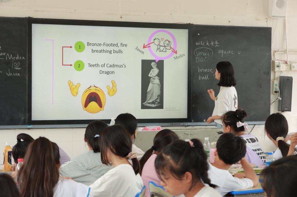 选取古希腊神话《伊阿颂和金羊毛的故事》,实践团成员阮澜茵和夏慧借助多媒体演示功能,结合图片和动画讲解伊阿颂的英雄之路,寓教于乐,激发同学们学习古希腊神话的兴趣。在故事的讲解中,阮澜茵和夏慧穿插英语词汇教学,就故事中内涵丰富的情节提出“伊阿颂是不是一个好的领导者”的问题,并鼓励同学们写下自己的见解,引导其透过现象看本质,通过故事反思现实,于细节之处思考,在故事中挖掘人性的真实。课堂末尾,实践团成员通过播放视频来帮助同学们回顾课堂上学习的神话故事,巩固其对神话故事的理解记忆,同时进一步加深其对古希腊神话中体现的价值观和文化特点的思考。
